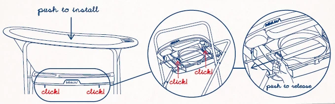 Met behulp van het click-systeem plaats je het badje eenvoudig en ‘met 2 clicks’ op de Bébé-Jou Click badstandaard. Net zo makkelijk ‘click’ je het badje weer los door aan de onderzijde van de standaard het systeem in te knijpen.
