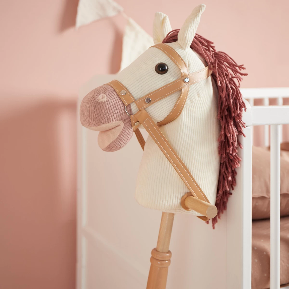 Ginger heeft een heerlijk zacht hoofd en een tot in detail uitgewerkte halster. Lekker rondrijden op dit stokpaardje is niet alleen heel leuk, het laat je kindje ook zijn of haar fantasie en inbeeldingsvermogen ontwikkelen.Â