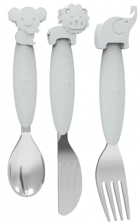 Het bestek heeft een siliconen handgreep in combinatie met roestvrij staal. De schattige dierenfiguurtjes (koala, leeuw en olifant) maakt het zelfstandig leren eten meteen stuk leuker! Smakelijk eten!