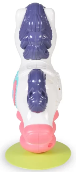 De pony is geschikt voor kinderen vanaf 12 maanden en werkt op 2 AA batterijen (inbegrepen). Daarnaast bevat de speelgoed pony een standaard met zuignap, ideaal wanneer je kindje in de kinderstoel zit.Â