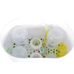De sterilisatiefunctie zorgt ervoor dat flesjes en accessoires zoals spenen en fopspenen steriel schoon worden. Hij heeft plaats voor 6 smalle hals flessen of 4 brede hals flessen en bevat een mandje waar je de accessoires in kunt leggen. Om te steriliseren gebruik je 80 ml water, dit meet je gemakkelijk en nauwkeurig af met de meegeleverde maatbeker. Wanneer het proces klaar is, gebruik je de meegeleverde flessentang om de schone (en tevens nog warme) spulletjes eruit te halen.Â
