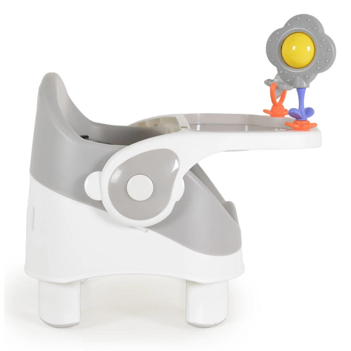 De Pistachio heeft een dubbel en verstelbaar eetblad (3 posities) dat makkelijk schoon te maken is, handig! Daarnaast zitten er twee vrolijke speeltjes aan het blad, waardoor je kindje zich voor of na het eten niet zal vervelen in het stoeltje. De 3-punts gordel zorgt ervoor dat je kindje altijd veilig zit in de verhoger. Eet smakelijk!