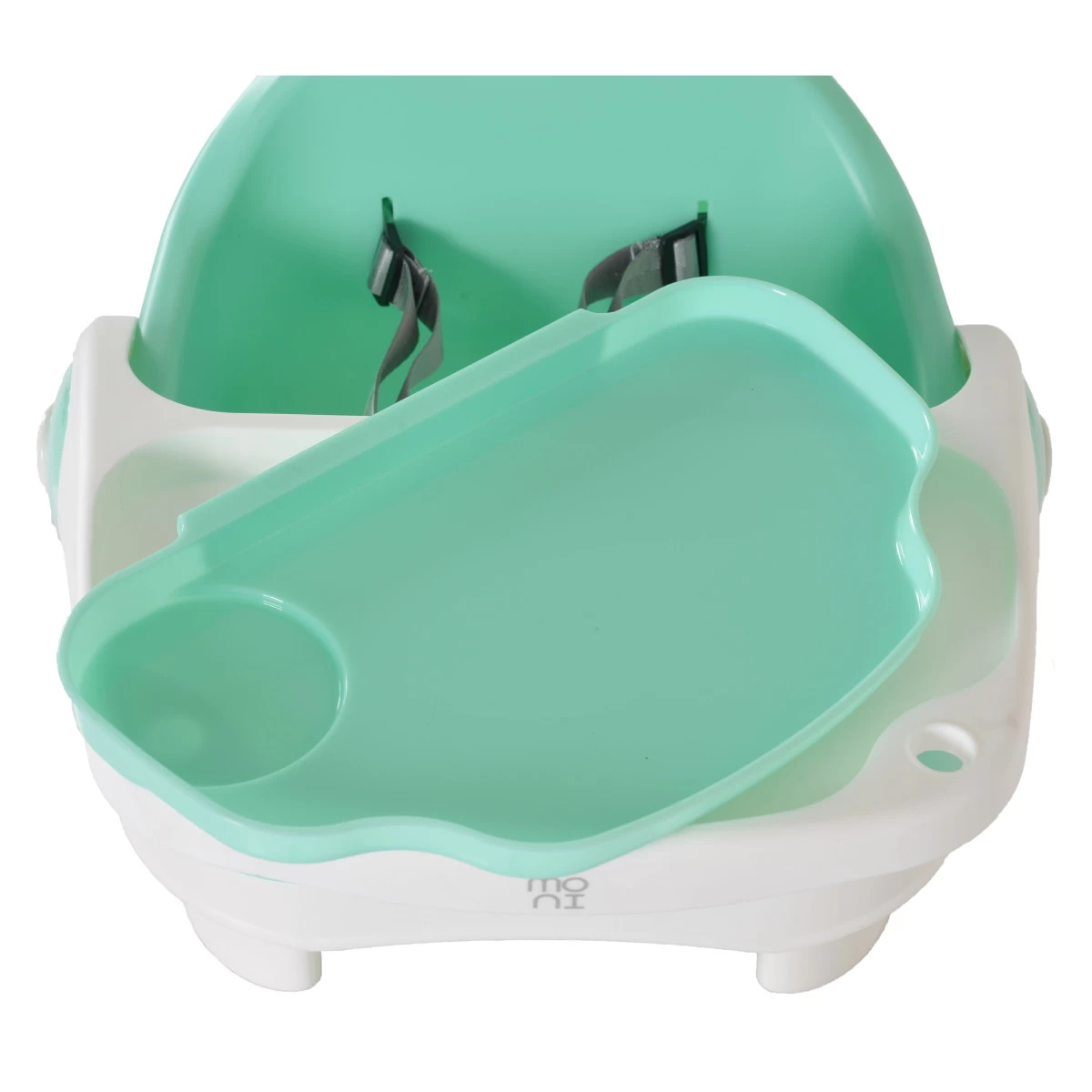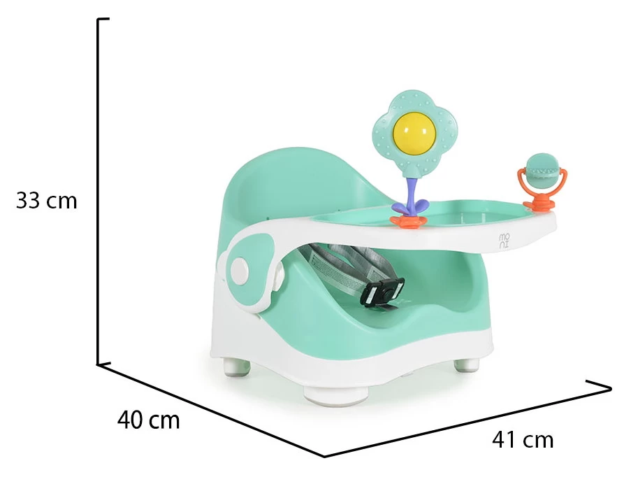 De Pistachio heeft een dubbel en verstelbaar eetblad (3 posities) dat makkelijk schoon te maken is, handig! Daarnaast zitten er twee vrolijke speeltjes aan het blad, waardoor je kindje zich voor of na het eten niet zal vervelen in het stoeltje. De 3-punts gordel zorgt ervoor dat je kindje altijd veilig zit in de verhoger. Eet smakelijk!
