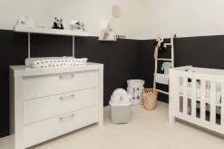 De deksel van deze luieremmer is uitgerust met een kinderslot, waardoor nieuwsgierige, oudere kindjes de emmer niet zomaar kunnen openen. In de luieremmer is plaats voor ongeveer 40 luiers (newborn), waardoor je hem maar eens in de 4/5 dagen hoeft te legen.Â