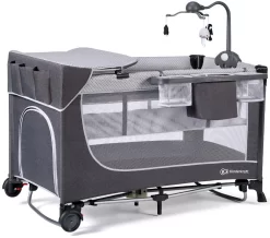 Dit campingbed is uitgerust met een hoop extra accessoires! Zo wordt het bedje geleverd inclusief extra poten voor een schommelfunctie, een speelmobiel, een aankleedvlak en een handig rekje om alle verzorgingsspulletjes van je kleine in op te bergen. Extra handig én een complete set dus!