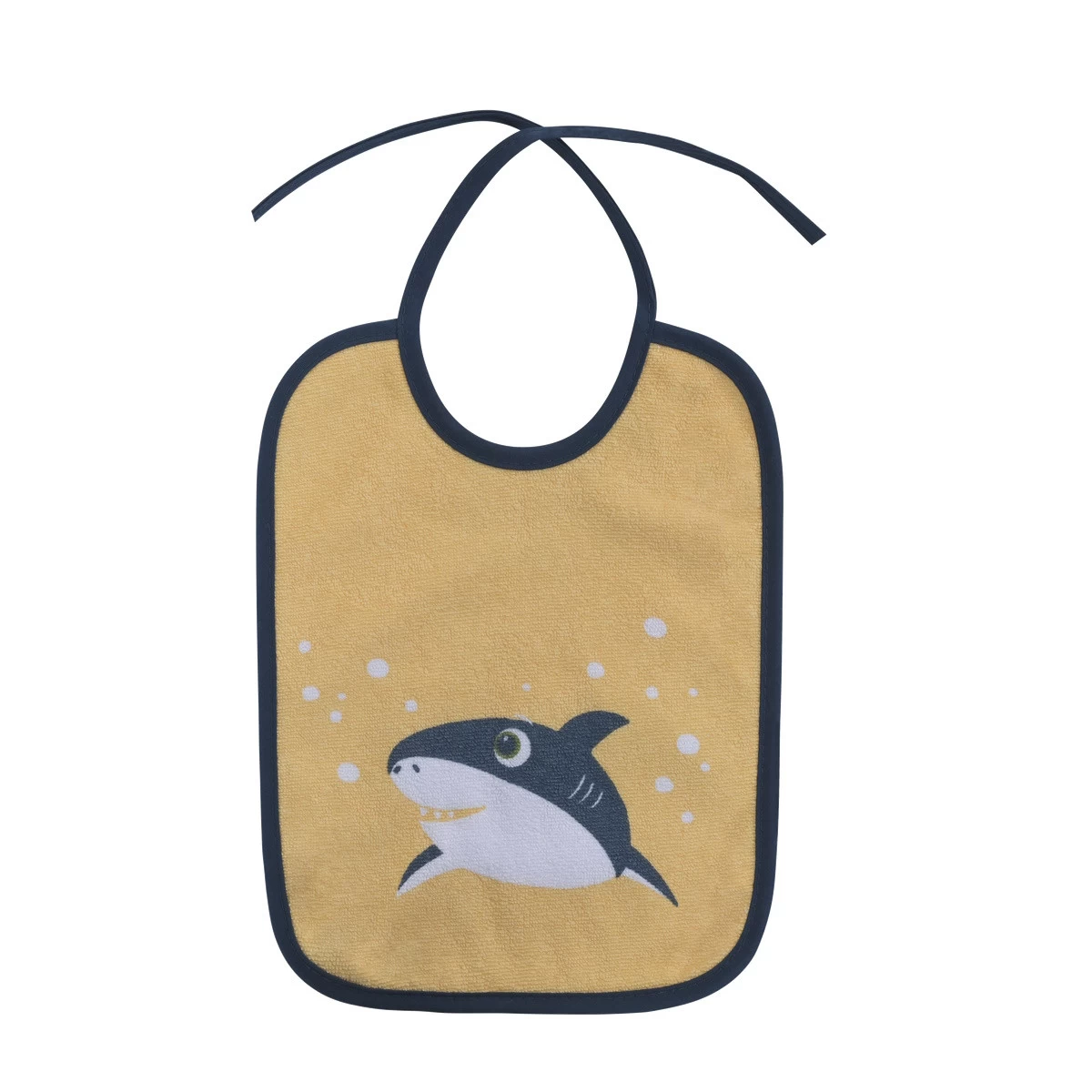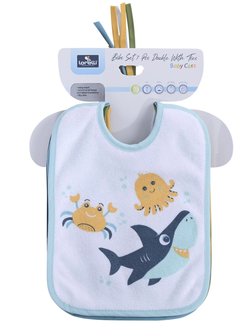 De set heeft 7 unieke printjes met een oceaanthema met dieren zoals haaien en kwalletjes. Zo is elke maaltijd weer een unieke ervaring. Door de achterzijde van PEVA blijven de kleren van je kleine schoon, ook al wordt er flink geknoeid. Daar draagt de fijne combinatie van katoen en polyester stof aan de voorzijde ook aan bij. Deze double set heeft een dubbele laag stof aan de voorzijde waardoor deze beter absorbeert en steviger aanvoelt.