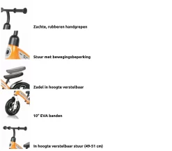 Deze loopfiets heeft rubberen handvaten, die anti-slip zijn. De banden van 10 inch zijn gemaakt van EVA-foam en zullen daardoor niet gauw lek zijn. Uren speelplezier gegarandeerd!Â
