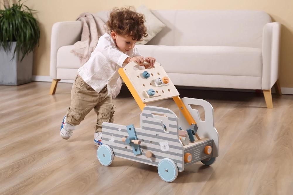 Spelen met de gereedschap loopwagen is niet alleen heel leuk, maar ook leerzaam. Het draagt bij aan de ontwikkeling van de hand-oog coördinatie, creativiteit en motorische vaardigheden. Hij is geschikt voor kindjes vanaf 18 maanden.Â