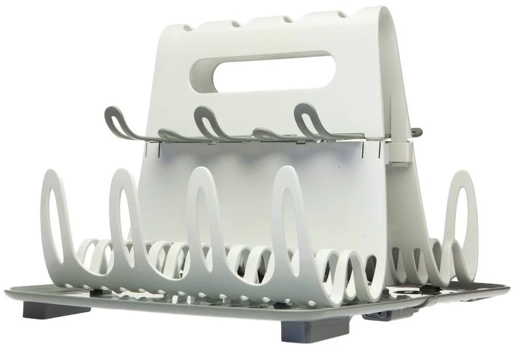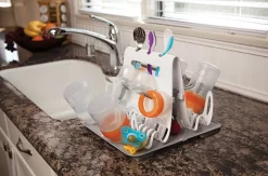 Dankzij de 8 grote haken kun je alle flesjes in alle vormen en maten laten drogen aan het rekje. De 10 kleinere haken zijn ideaal voor de kleinere accessoires. Bovenin het rekje vind je 3 openingen voor bijvoorbeeld bestek, rietjes en andere kleine keukenaccessoires. Het water wordt opgevangen in de bodemlaag van het rekje.