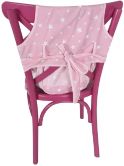 Doordat je de stoelverhoger vastknoopt kan je hem zo hoog hangen als je wil, waardoor deze geschikt is om te gebruiken aan bijna iedere tafel.