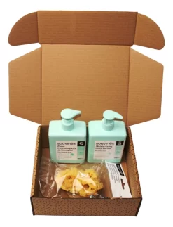 - Bestaat uit: foam gel & shampoo (500ml), hydraterende bodylotion (500ml) en een natuurlijke spons