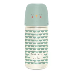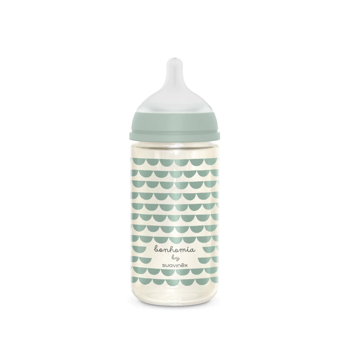 Wat een leuke fles is dit van Suavinex uit de bonhomia collectie! Deze glazen fles is perfect van formaat en zorgt ervoor dat de voeding voor jouw kindje sneller warm wordt en blijft. De buitenkant van de fles is minder warm dan de voeding in de fles zelf, wat het prettig maakt om de fles vast te houden.