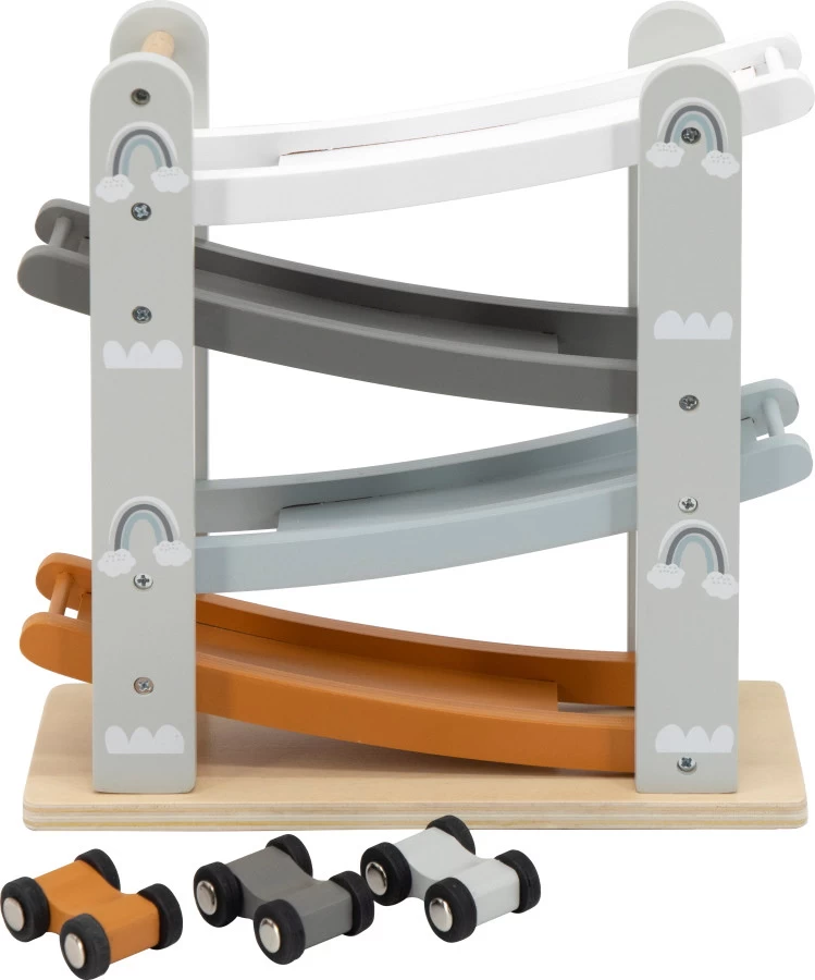 De autobaan is gemaakt van hout en heeft mooie, neutrale kleuren. De print van regenboogjes en wolken maken hem af! Ook nog eens een leuke toevoeging voor de kinderkamer. Geschikt vanaf 18 maanden.