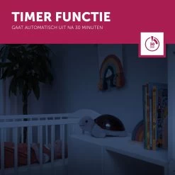 Je hebt de keuze uit drie soorten geluiden tijdens het in slaap vallen: Afrikaanse geluiden, hartslag of slaapliedjes (drie melodietjes). Ook kun je 2 volumeniveaus kiezen: hard of zacht. Begint je kindje te huilen? Tim de Schildpad heeft een huilsensor en zal dan automatisch aan gaan (optioneel). De projector werkt op 3-AA batterijen, deze zijn niet inbegrepen.